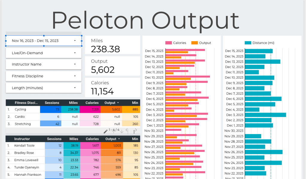 Background: I work out as often as I can and the data from each workout can be downloaded from their website, placed in google docs, and a dashboard can be setup using Looker (formerly Google Data Studio)